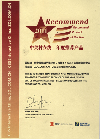 梅捷A75+喜獲中關(guān)村2011年度推薦產(chǎn)品獎