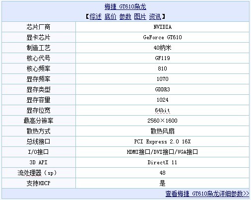 顯卡,這款顯卡標(biāo)配了2G顯存。目前該款顯卡已經(jīng)到貨長(zhǎng)春,經(jīng)銷商“長(zhǎng)春藍(lán)?萍”報(bào)價(jià)僅售399元,有需要的用戶可直接前往購(gòu)買。梅捷GT610浩龍顯卡采用40nm工藝制程的GF119顯示核心,顯卡核心內(nèi)建48個(gè)CUDA核心、8個(gè)紋理單元和4個(gè)光柵單元。顯卡支持DX11、CUDA及PhysX等技術(shù),同時(shí)支持3DVision中的照片、電影和藍(lán)光,并集高清視頻解碼加速與后期處理于一身。