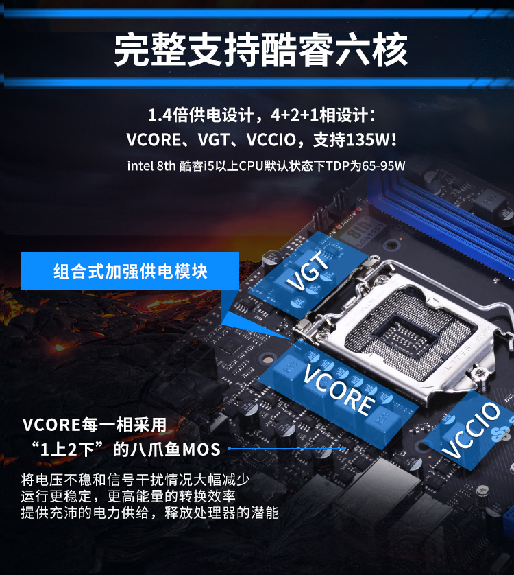 梅捷狂龍B360M采用7相供電,完整支持第八、九代酷睿處理器,1.4倍供電設(shè)計最高支持135W。選用服務器級的電器元件,全固態(tài)黑金電容,發(fā)熱量更低,低溫八爪魚MOSFET,更低阻抗更高效率,更低的發(fā)熱量提升主板的穩(wěn)定性,全封閉的鐵素體電感,完善的屏蔽能力,減少電磁干擾,電流容量提升30%,散熱性能更佳穩(wěn)定高效,保證主板長久穩(wěn)定高效的使用。