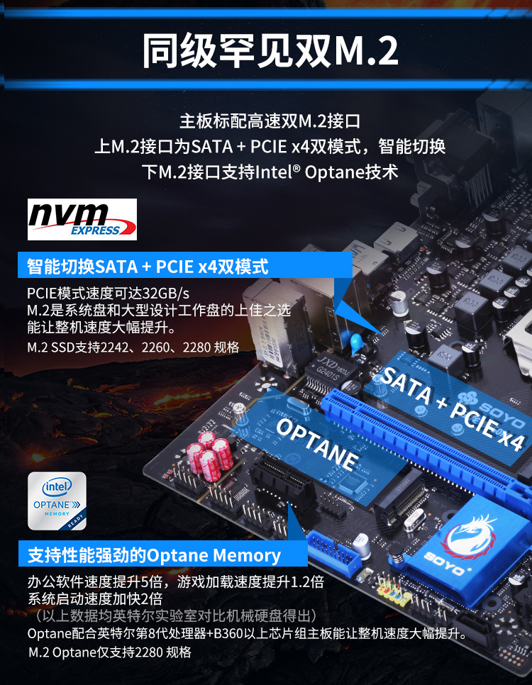 主板標配高速雙M.2接口,智能切換SATA+PCle*4模式,速度可到32GB/S。還可支持英特爾Optane加速技術(shù),讓你的機械硬盤更上一層樓。M.2讓整機的速度大幅提升,游戲加載速度也大大提升。