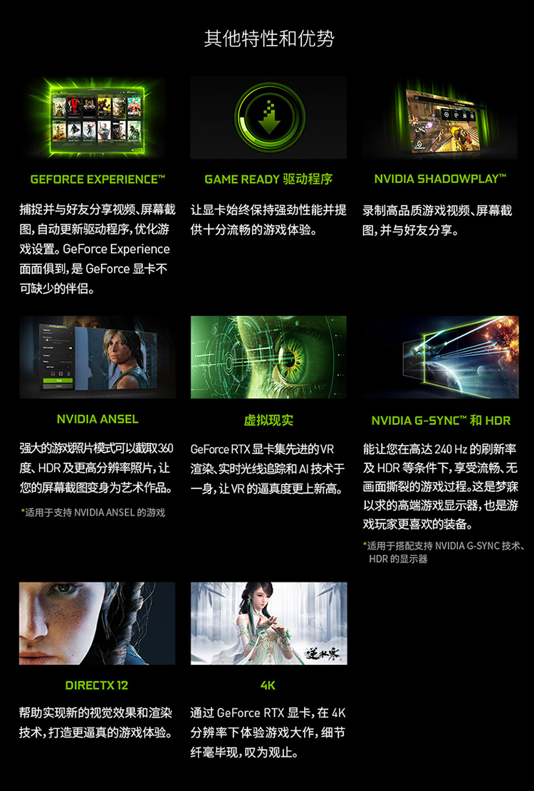 支持Simultaneous Multi-ProjectionVR圖像矯正技術(shù),VRWorks Audio虛擬現(xiàn)實音頻技術(shù),Ansel截圖功能,PhysX物理加速技術(shù),NVIDIA CUDA,PureVideo HD高清硬件解碼,動態(tài)超級分辨率,MFAA,GeForce 3D Vision,GameWorks™,G-Sync™-Ready,GameStream™-Ready,GeForce ShadowPlay™,GPU Boost™
